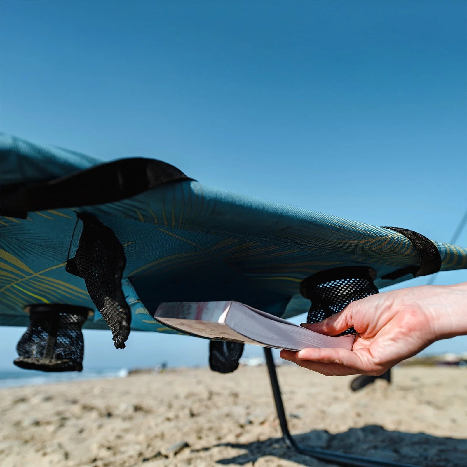 - Book stash pocket underneath