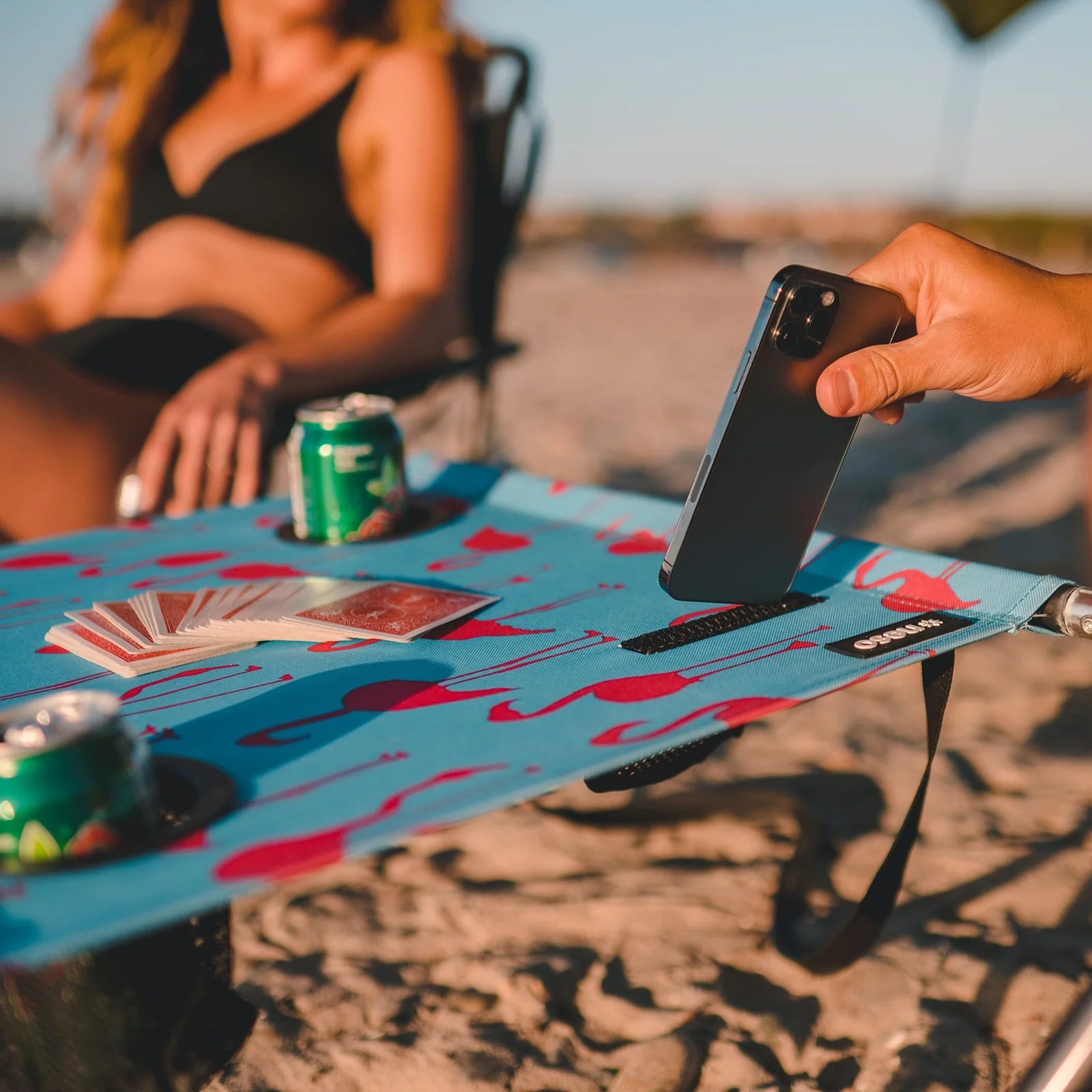 The perfect beach table.  Extremely portable, lightweight and compact design.  Water resistant.  Stable in the sand.