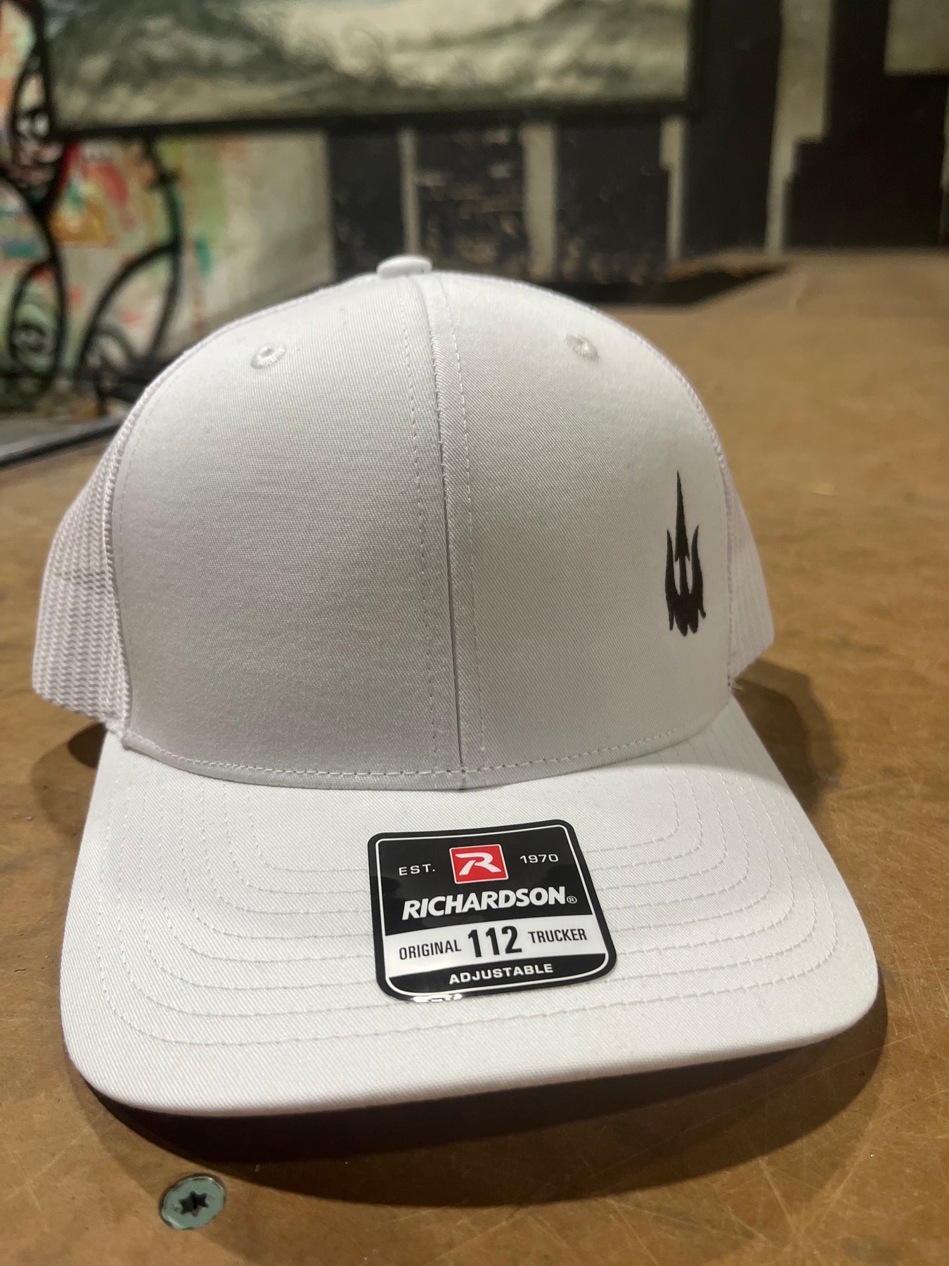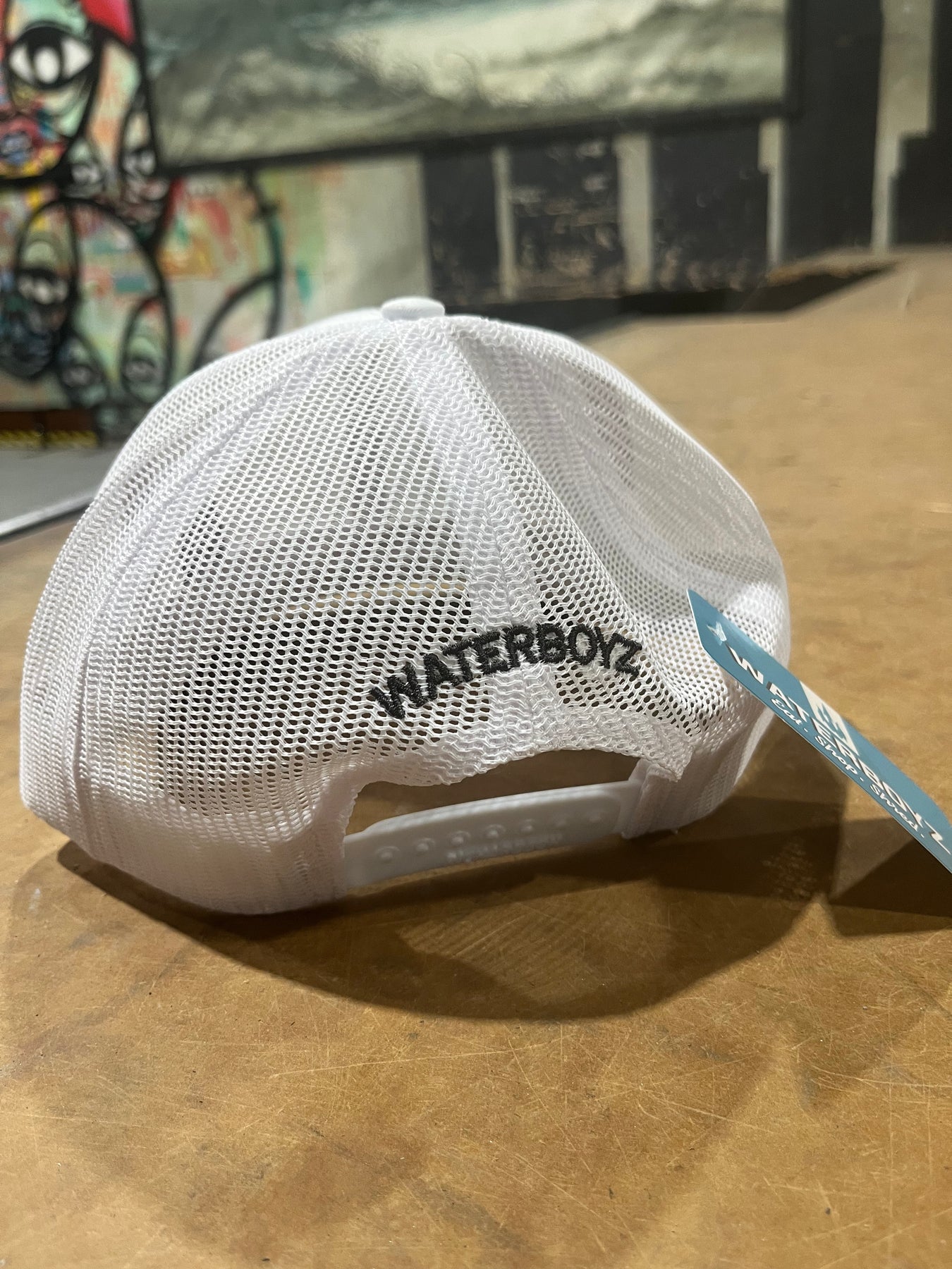 The Waterboyz signature script in a dark grey on a white Richardson 112 hat. 60/40 cotton/polyester 100% polyester mesh back Structured, six-panel, mid pro profile Pre-curved bill Adjustable plastic snapback