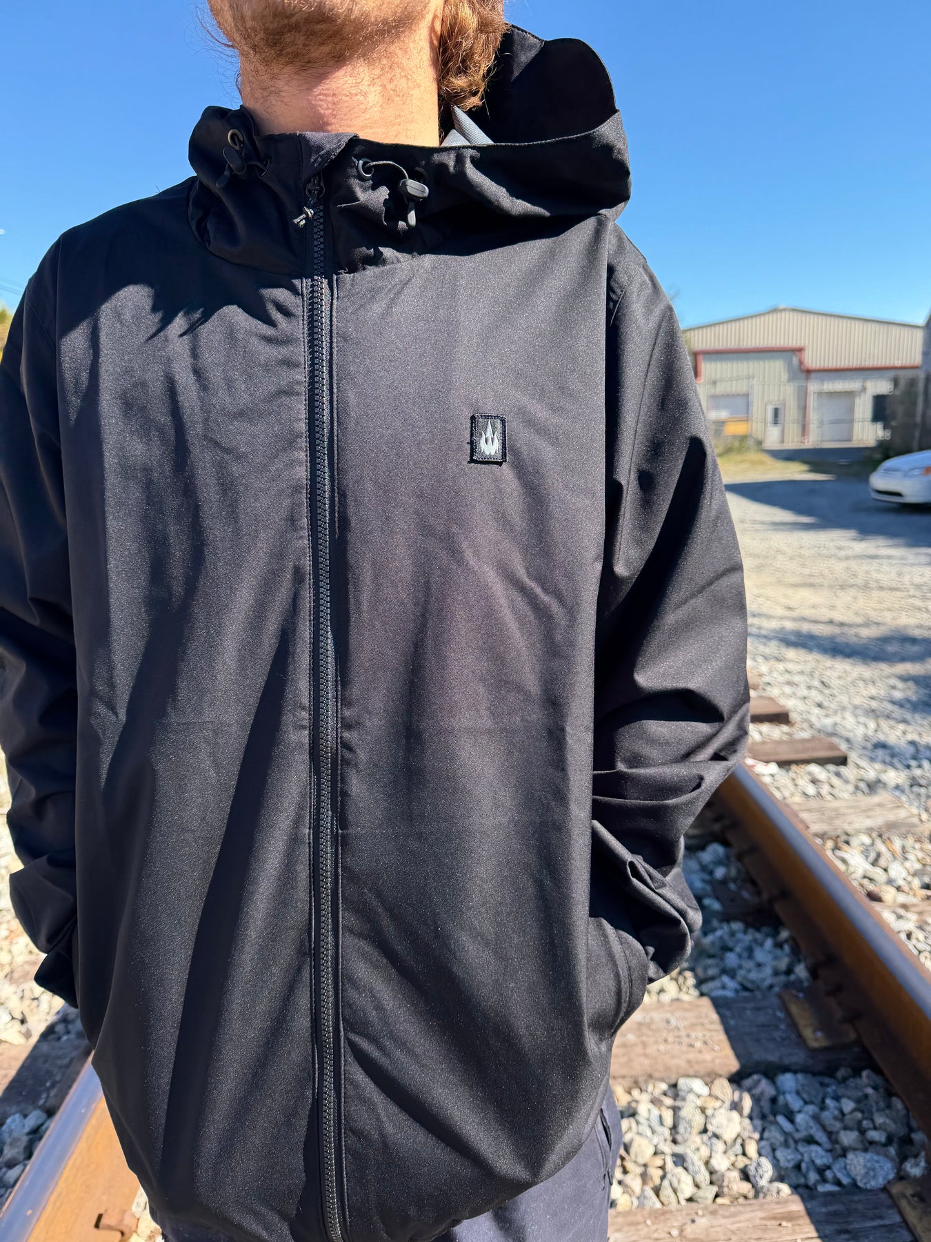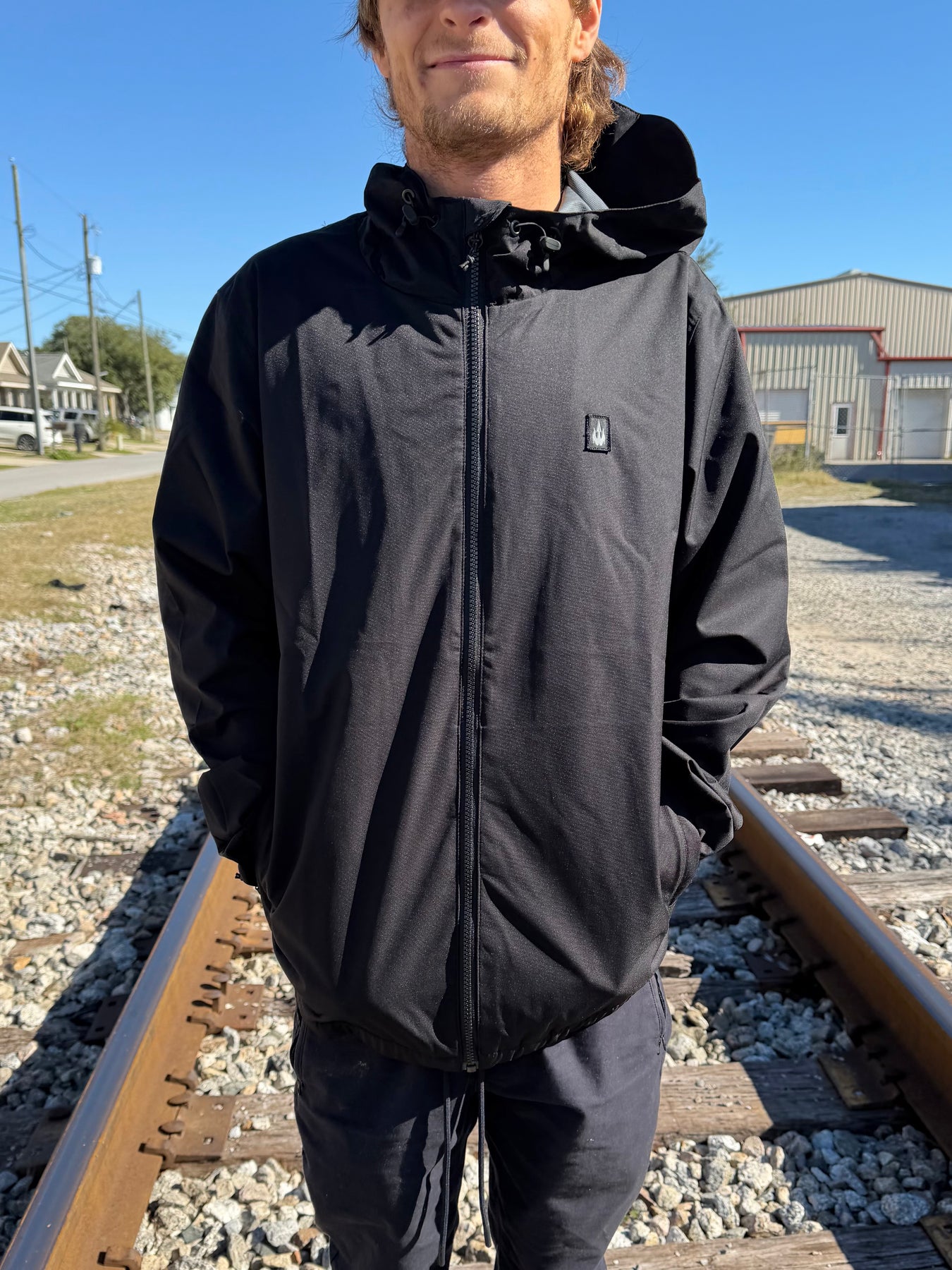 FABRIC: 100% Polyester • FIT: Relaxed fit • Durable Water Resistance • Tech hooded rain jacket with, side zip pockets, rubberized zipper head & eyelet detail