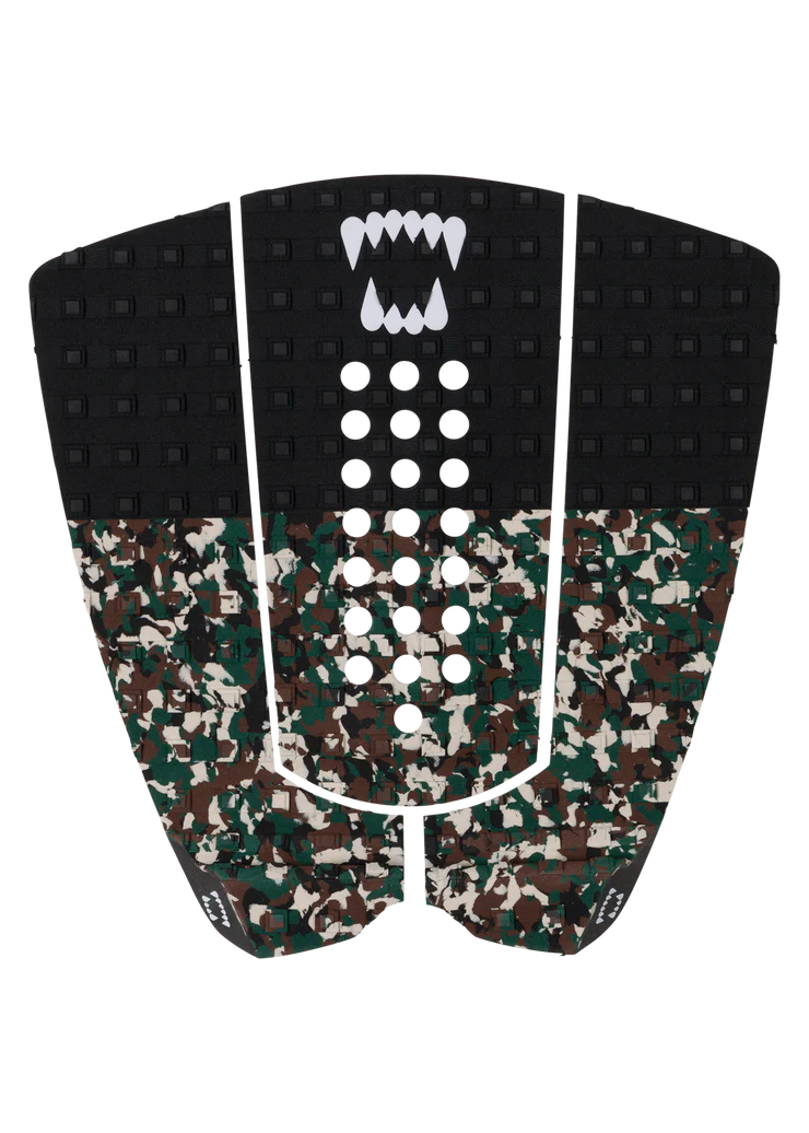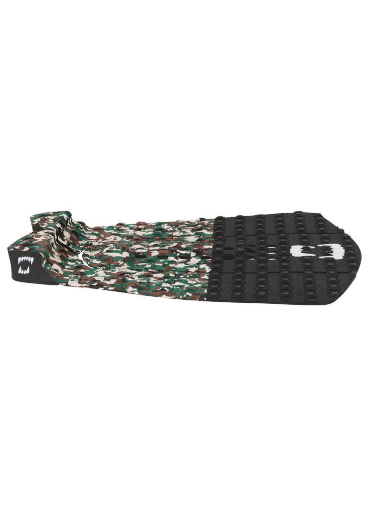 The Slayer is a 3-piece traction with a wider center arch for a more subtle curve under foot. The pulled in tail kick is designed to fit the curve of a round tail, but can also be used on narrower squash or swallow tails.